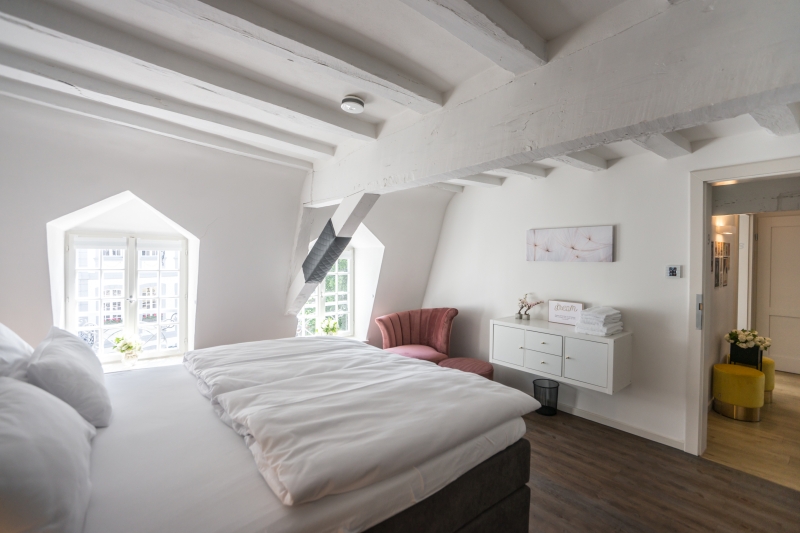 Genießen Sie die Verbindung aus traditionellem Charme und modernem Flair – unser Stadthaus bietet dazu Platz auf drei Ebenen: das 1. Obergeschoss mit einem Doppelzimmer, das 2. Obergeschoss mit fünf Doppelzimmern und das 3. Obergeschoss mit vier Doppelzimmern.